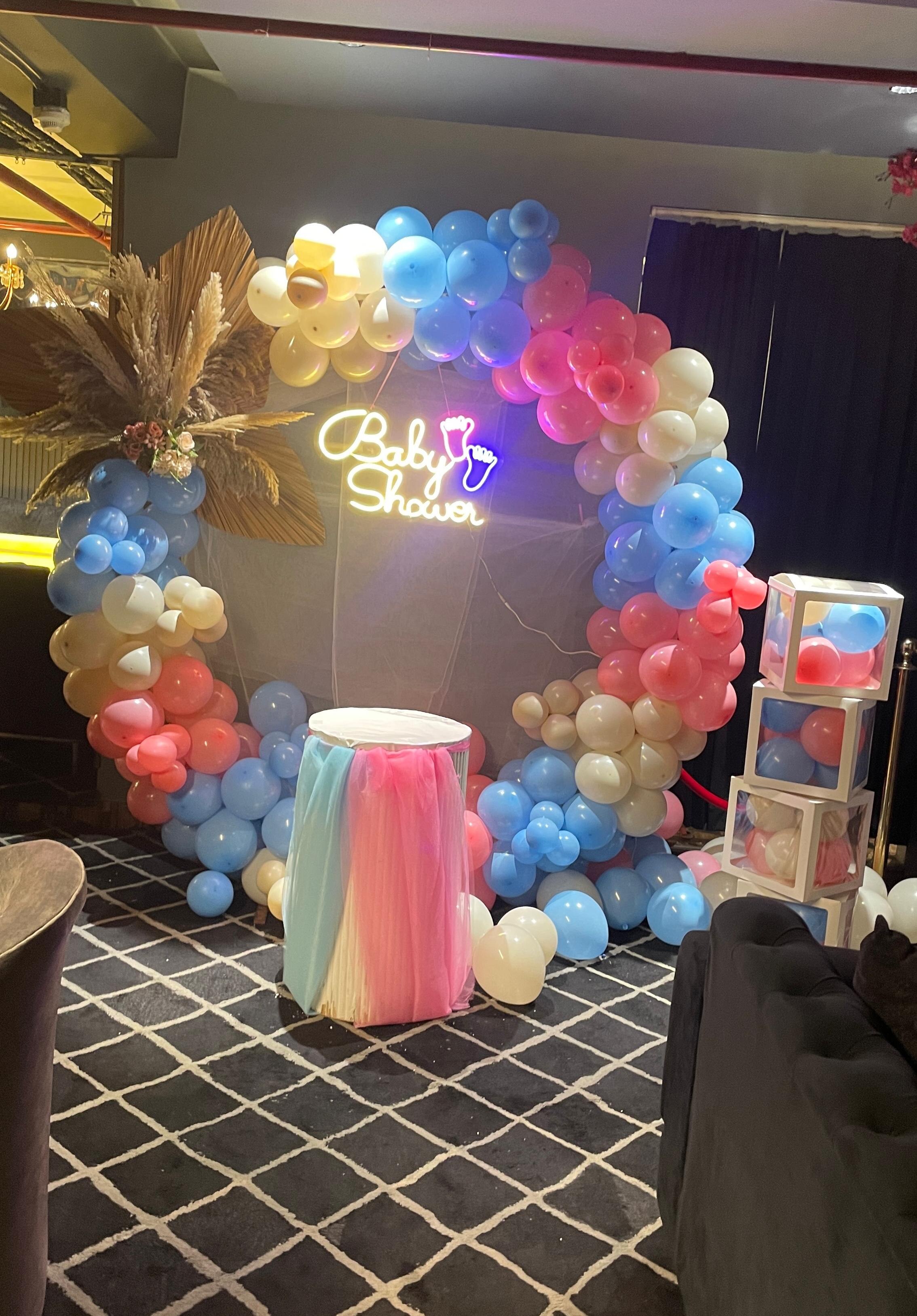 Surprise your loved ones with this stunning Pink, blue and White balloon ring decoration, complete with a ‘Baby shower neon light’ Cake table, flower bouquet and 4 Baby box with balloons inside