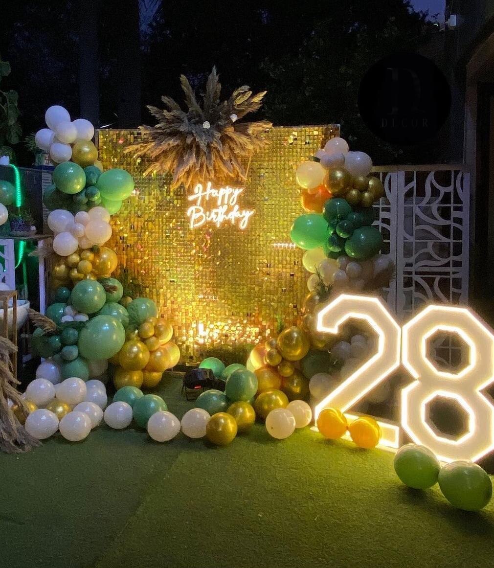 Surprise your loved ones with this premium Sequin backdrop decoration, featuring a ‘Happy Birthday’ neon light, themed balloons, LED Age Letter and cake table.